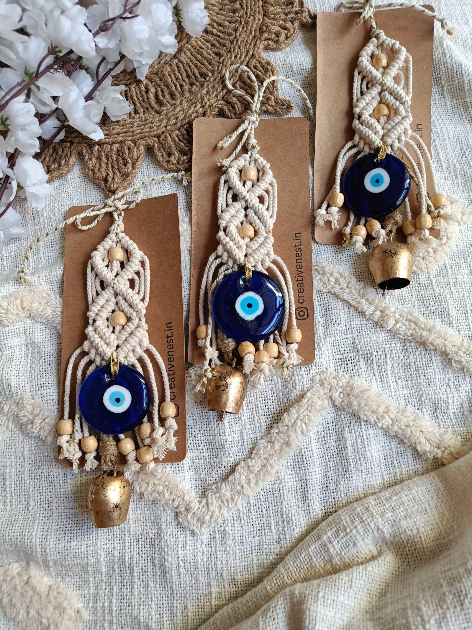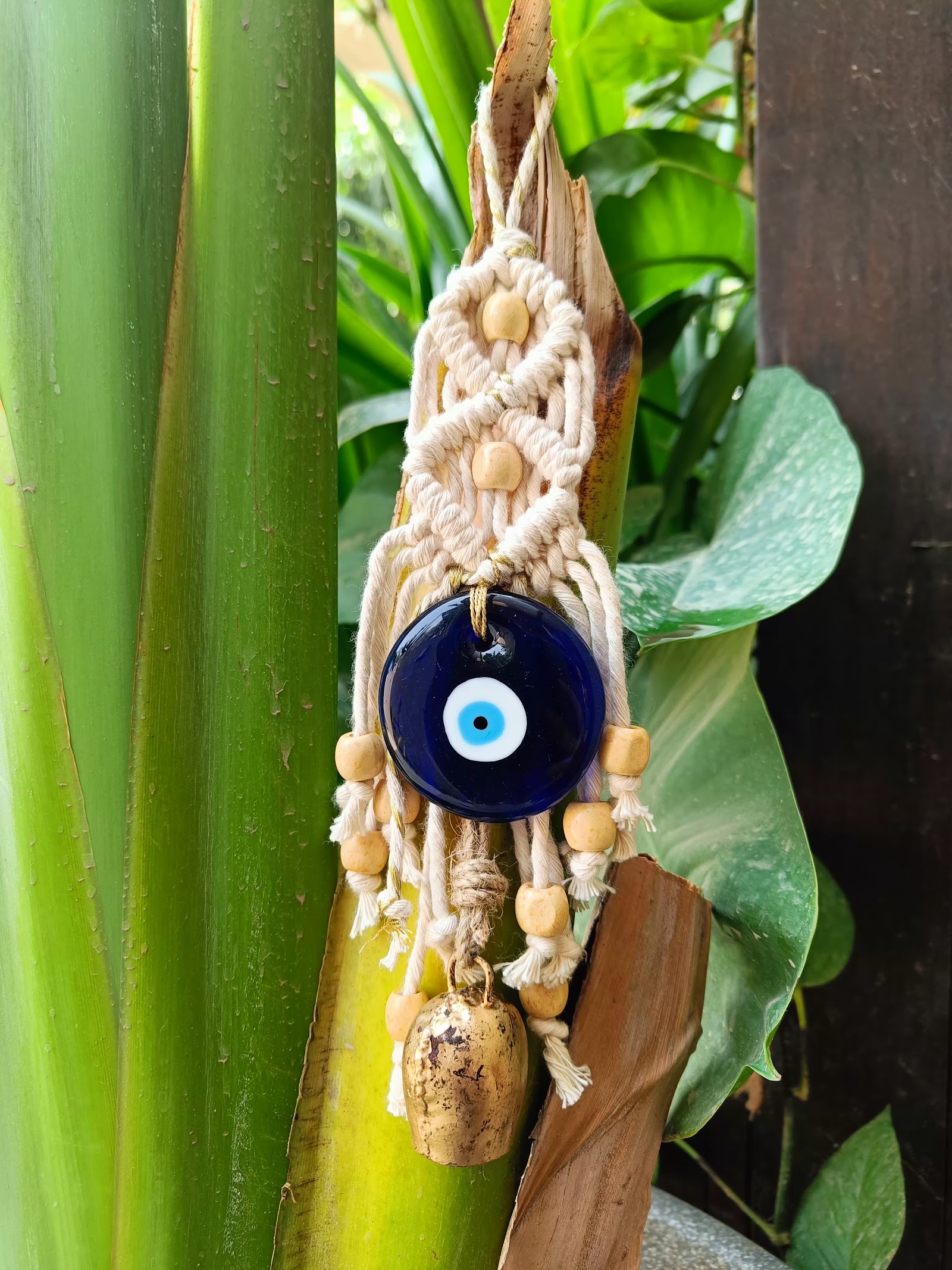 Add a touch of rustic elegance and positive energy to your space with our Macrame Evil Eye Charm with Antique Bell.