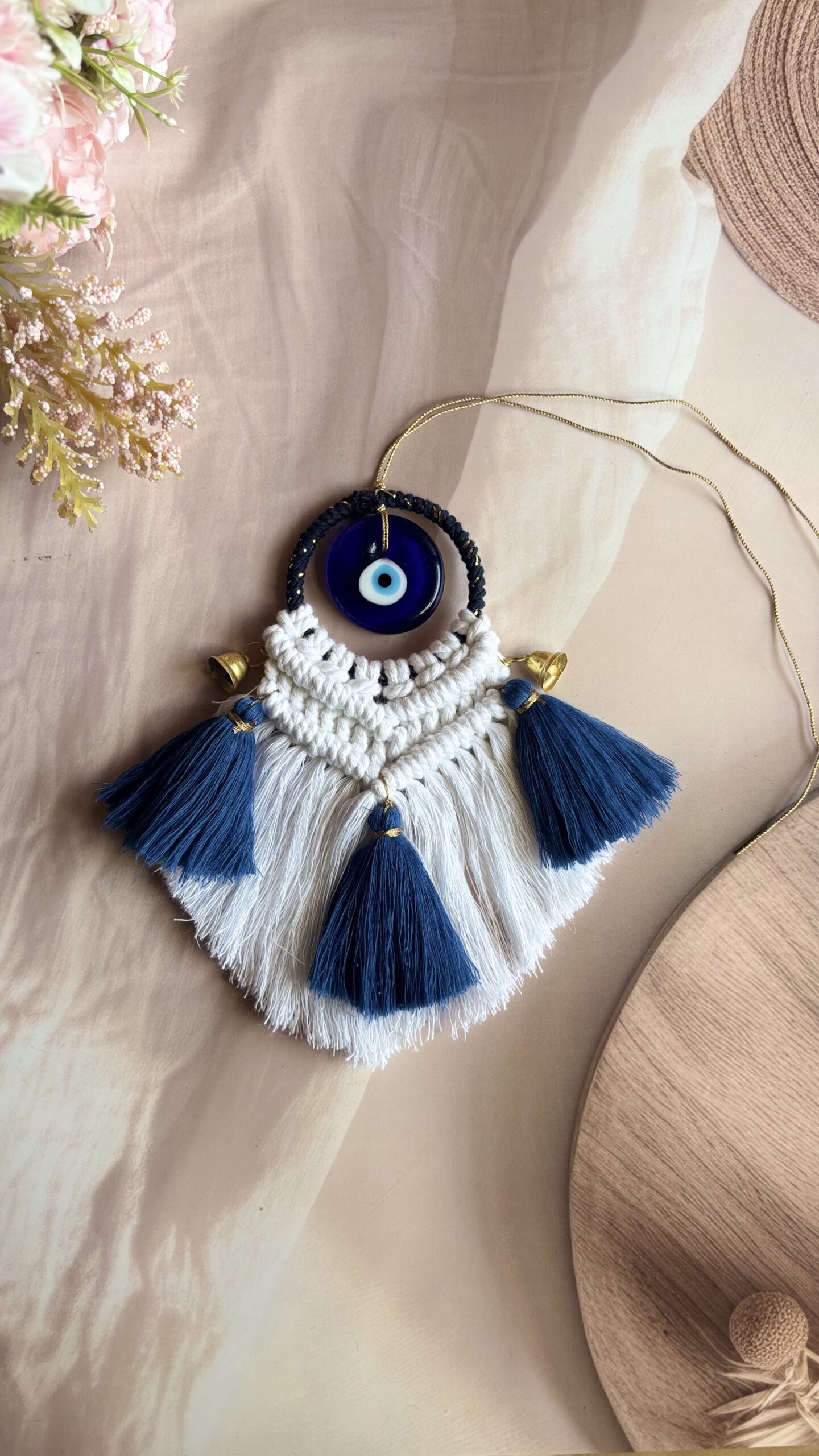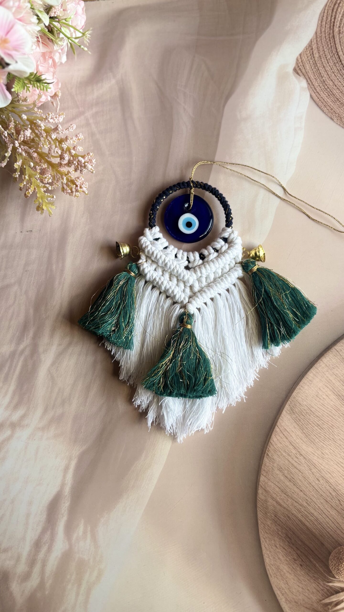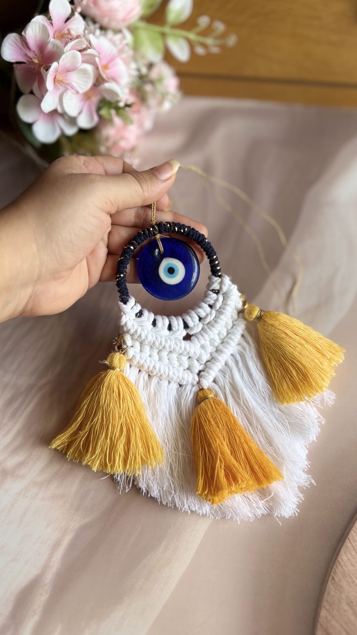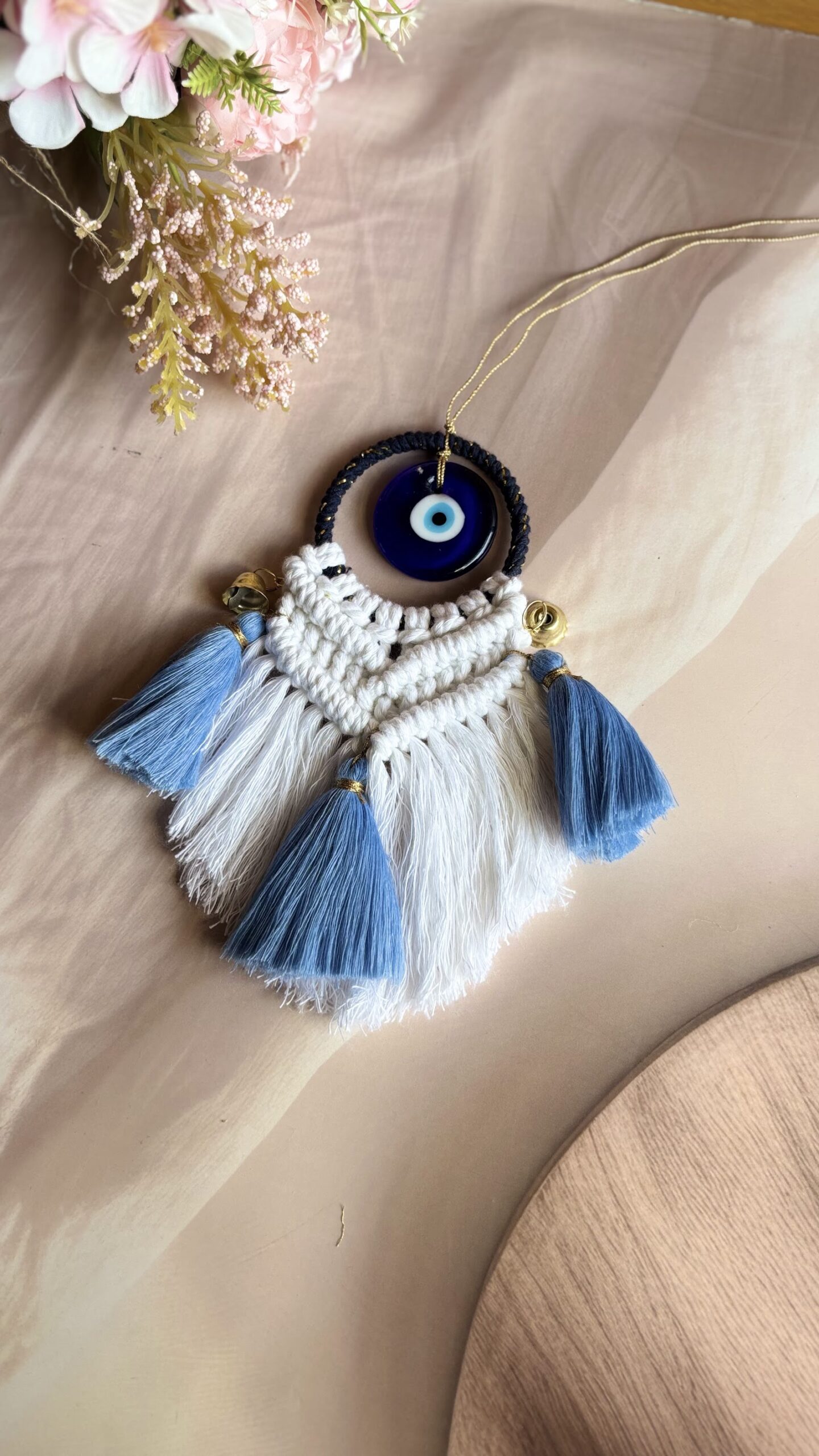 Handcrafted with love, this Macrame Evil Eye Charm is designed to add a touch of beauty while protecting your space from negative energy. Featuring a classic evil eye bead, soft cotton fringes, and vibrant tassels, it’s perfect for your home, car, or workspace decor. ✨ Available in multiple elegant colour combinations ✨ Lightweight & easy to hang ✨ Each piece is uniquely handmade