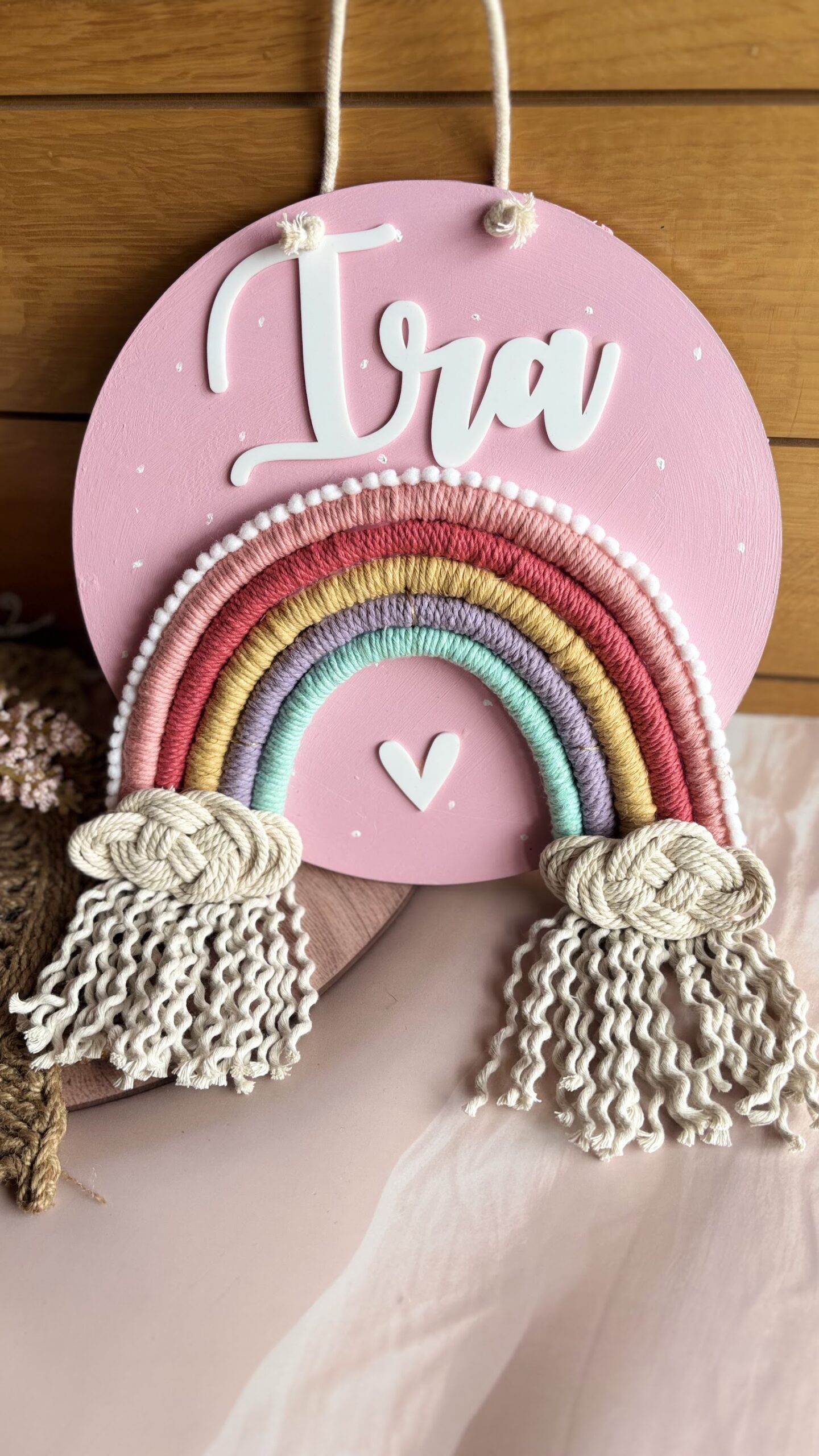 Premium cotton macrame cord, Wooden MDF ring base with customised name Acrylic cutout.